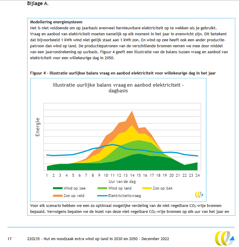 • ‘Met windmolens maken we de hele dag door energie, ook ’s nachts. We hebben dan meestal genoeg aan de kabels die al in de grond liggen. Dit scheelt geld.’ Dat is dus gewoon niet waar. Wel als je alleen per maand kijkt, maar niet als je per uur kijkt. Dan blijkt de meeste windenergie óók overdag geproduceerd te worden, terwijl de zon dan ook schijnt (ook met bewolkt weer doen die panelen het), zie deze grafiek ut het onderzoek door CE-Delft: